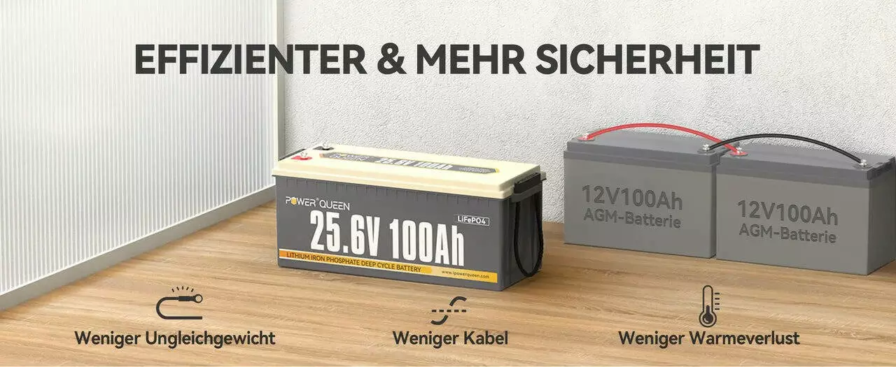 - При 100% DOD (глубина разряда) 1 аккумулятор Power Queen 24В 100Ач LiFePO4 имеет большую полезную емкость (2560Втч), чем 4 аккумулятора AGM 12В 100Ач только с 50% DOD (2400 Втч).