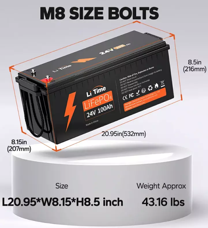 Теплые советы по применению батареи: Литиевая батарея LiTime 24V 100Ah не подходит для запуска гольф-кара, двигателя или любого другого устройства, которое будет генерировать большой ток в момент запуска.
