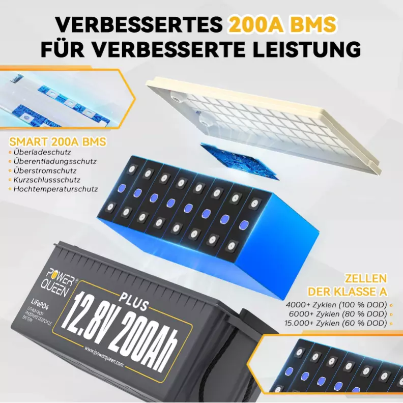 Аккумулятор Power Queen 12V 200Ah Plus LiFePO4, встроенная система BMS 200A