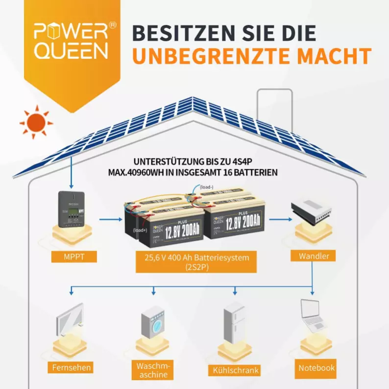 Эти батареи можно соединить до 4 параллельно и 4 последовательно. Это позволяет увеличить емкость (200Ач, 400Ач, 600Ач, макс. 800Ач) и напряжение (12,8В, 25,6В, 38,4В, макс. 51,2В). При использовании до 16 батарей можно создать аккумуляторную систему 51,2 В 800 Ач с 40,96 кВт-ч энергии. Это мощное решение для хранения энергии подходит для солнечной системы дома, системы аварийного питания и для поездок на автодоме.