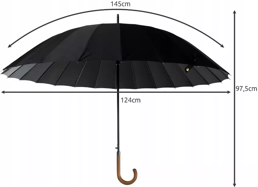 ✔️ СПЕЦИФИКАЦИЯ - цвет: черный; материал: ткань 350 т, алюминиевая труба, деревянная ручка; диаметр: 124 см; диаметр купола: 145 см; длина в сложенном виде 97,5 см; вес: 0,837 кг; вес в упаковке: 1.708 кг.
