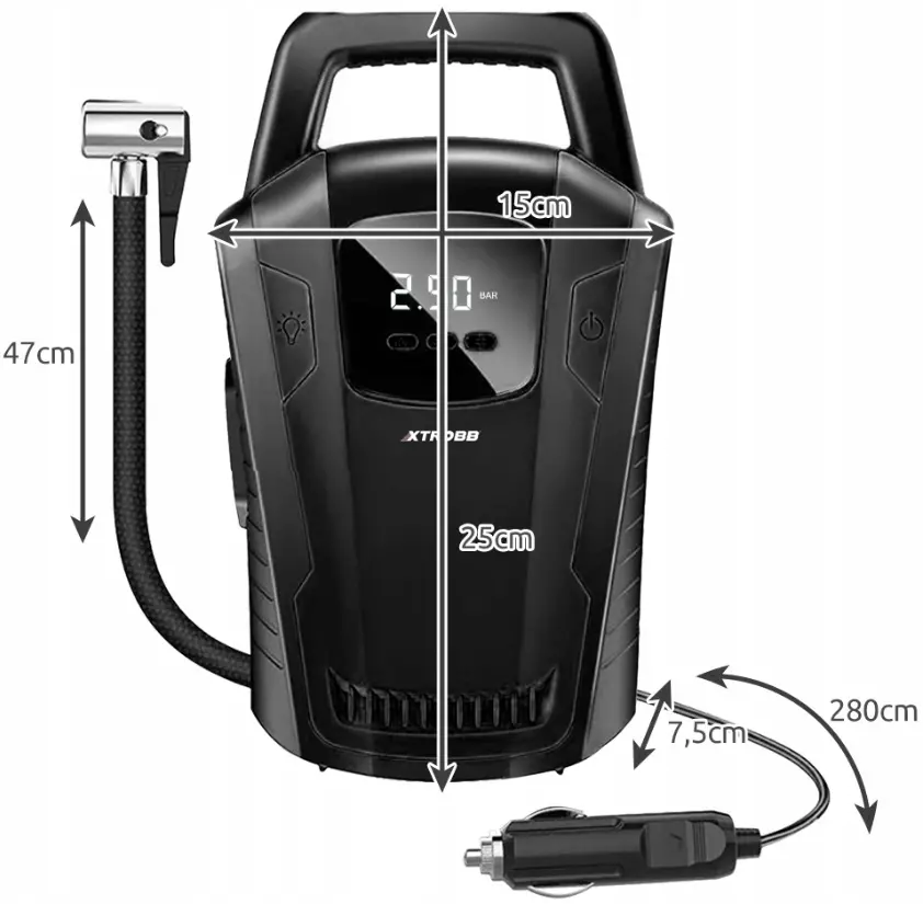 - АВТОМОБИЛЬНЫЙ - компрессор оснащен кабелем DC 12V длиной 2,8 м и напорным шлангом длиной 47 см с зажимом для накачивания колес автомобилей и мотоциклов. Кроме того, устройство оснащено фонариком, чтобы не остаться без света во время ночной поломки.