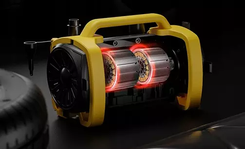 Компрессор 12 В оснащен новым, усовершенствованным электродвигателем, который работает более эффективно, производя больше воздуха за меньшее время.