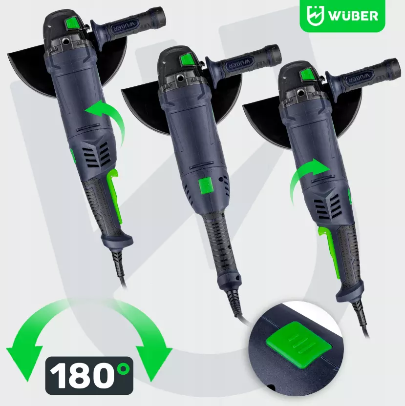 Мощность 2 400 Вт ► Поворотная рукоятка 180° ► Макс. скорость 8 500 об/мин ► Плавный пуск ► Нескользящая 3-позиционная рукоятка ► Резьба M14 ► Диаметр 230 мм ►