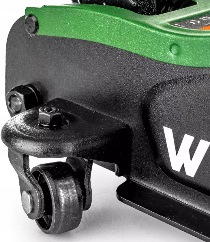 ► Поворотные ролики с подшипниками и прочные задние колеса делают домкрат мобильным и удобным для установки под автомобилем