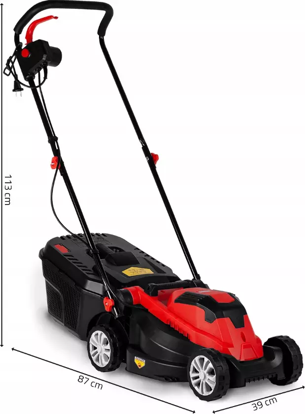 - Размеры косилки с корзиной: 87 x 39 x 113 см