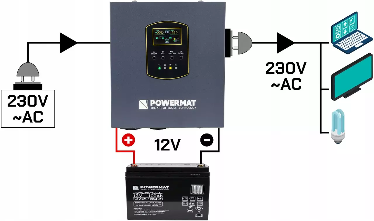 - Источник бесперебойного питания POWERMAT UPS — это устройство, которое прекрасно решает эту задачу. Позволяет подключить внешний аккумулятор (параллельно) с напряжением 12 В. Имеет две выходные розетки с напряжением 230 В, позволяет поддерживать работу двух устройств одновременно.