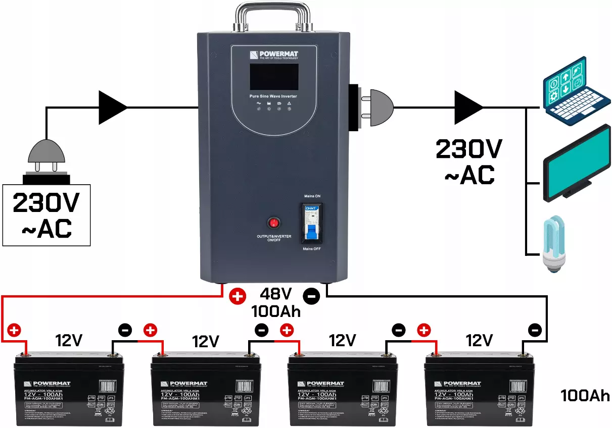 Источник бесперебойного питания (ИБП) PM-UPS-3000MP, предлагаемый компанией Powermat, обеспечивает бесперебойное питание и защиту многих устройств, таких как:
