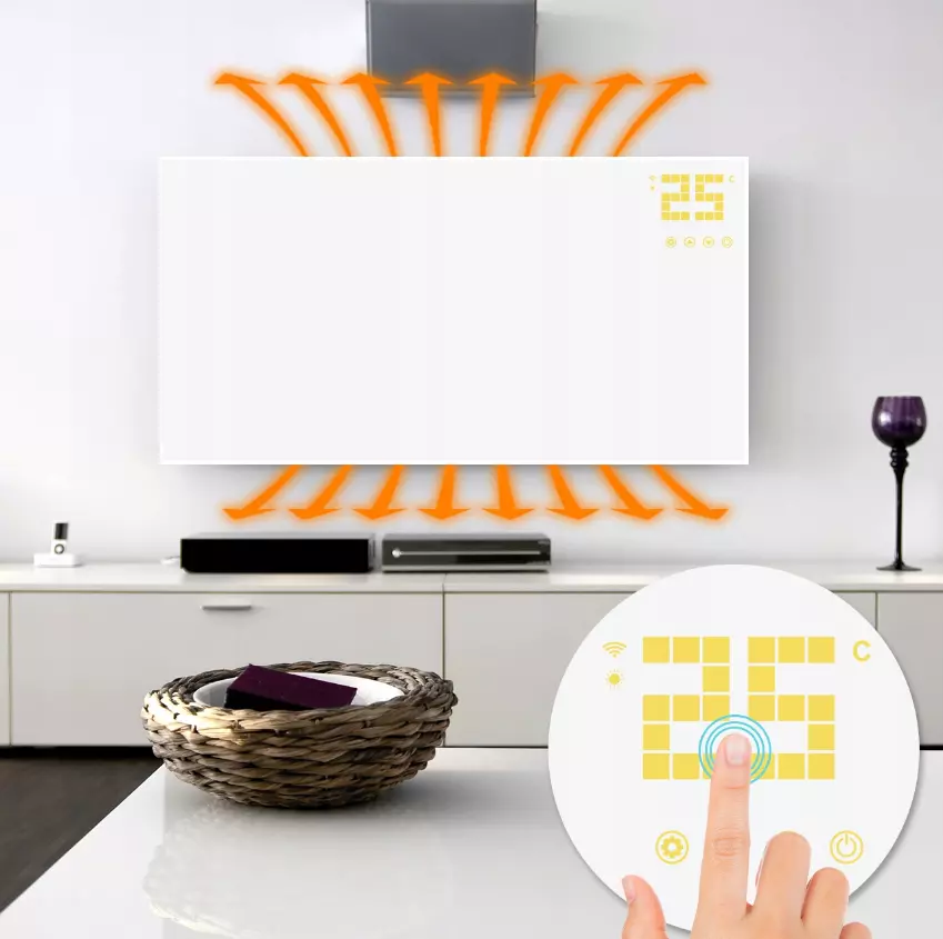 Нагреватель оснащен новым термостатом, управляемым сенсорным способом с передней сенсорной панели. При нажатии экран быстро загорается и тускнеет через 15 секунд бездействия.