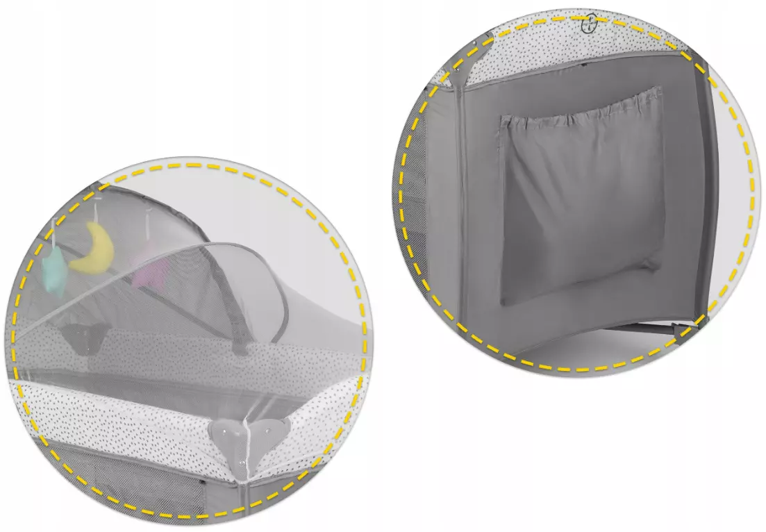 Практичный кармашек пригодится для детских мелочей. Чтобы ребенок спокойно спал, его не беспокоили насекомые и не страдал потом от укусов комаров, также предусмотрена москитная сетка.