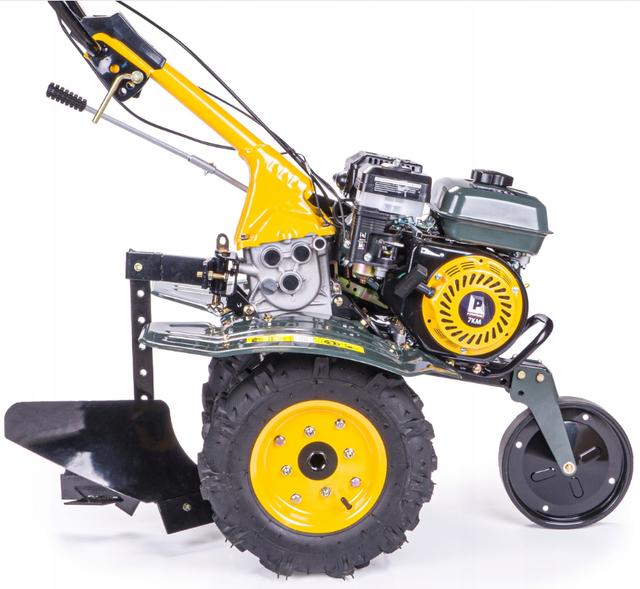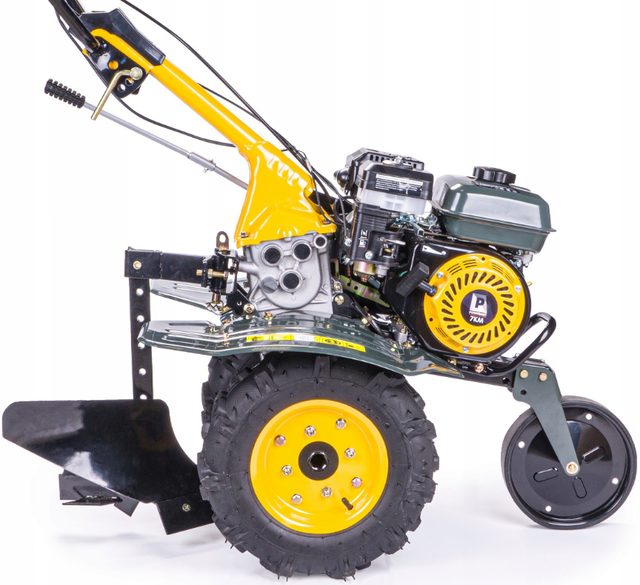 Благодаря двигателю внутреннего сгорания мощностью 7 л.с. вы не будете испытывать недостатка мощности даже в сложных условиях. Присоединенные ходовые колеса и направляющее колесо делают маневрирование машины простым и не требующим больших затрат сил пользователя.
