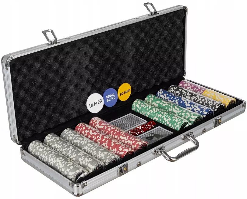 - материал (глина) + 5 игральных костей (ПП), + 2 колоды карт (ПП) + 2 ключа (железо) + 1 дилер (ПП) + 1 большой блайнд (ПП) + 1 малый блайнд (ПП) + 1 игровой коврик (полиэстер) в кейсе (внешний материал: алюминий, остальное: железо + ПП, внутренний материал: пенополиэтилен, остальное: ПП + фланель + МДФ)