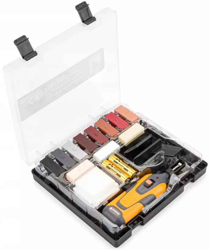 Набор POWERMAT позволяет самостоятельно устранять повреждения на деревянных и деревоподобных поверхностях. Его также можно использовать для ремонта повреждений на каменных и керамических поверхностях, в зависимости от выбора желаемого цвета шпатлевки. Воск, входящий в комплект, восстанавливает глубокие царапины, трещины, просверленные отверстия, потертости и зазубрины. 11 восковых палочек разных цветов позволяют выбрать нужный цвет. Воски можно свободно смешивать друг с другом для получения нужного оттенка. Разогретый воск заполняет полость, а после высыхания затвердевает и образует защитный слой.