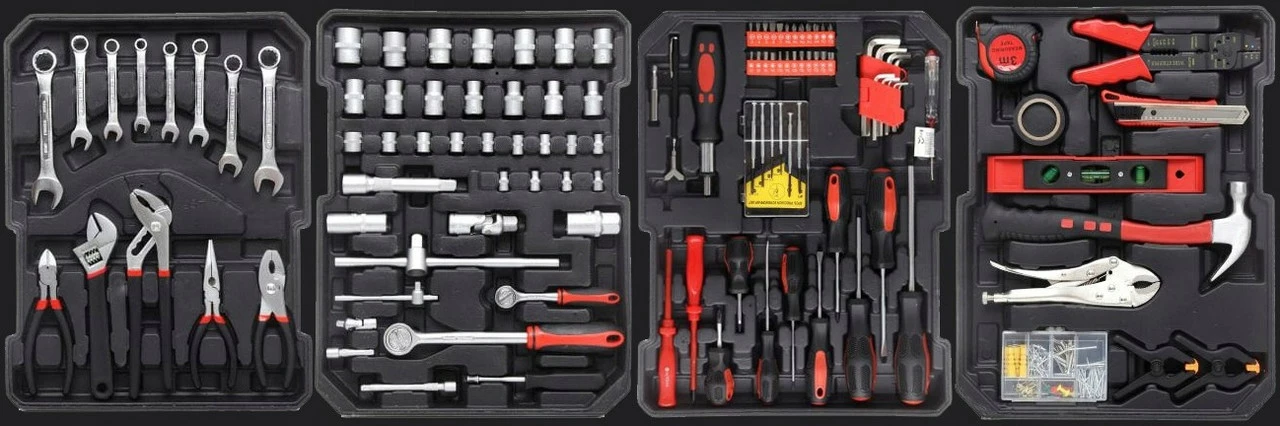 - В комплект входят: плоские гаечные ключи, торцевые ключи, трещотка, молоток, набор плоскогубцев, спиртовой уровень, зажимы, рулетка, изолента, нож, набор гвоздей и винтов, а также отвертки и биты.