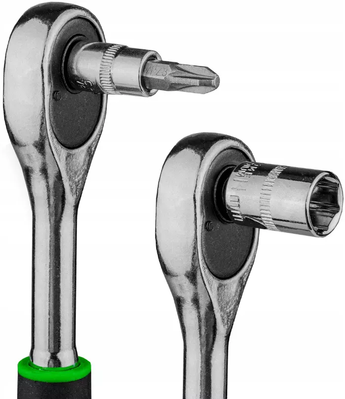 В комплект также входит трещотка с эргономичной рукояткой и 72-зубым механизмом, обеспечивающим плавную и точную работу даже в труднодоступных местах.