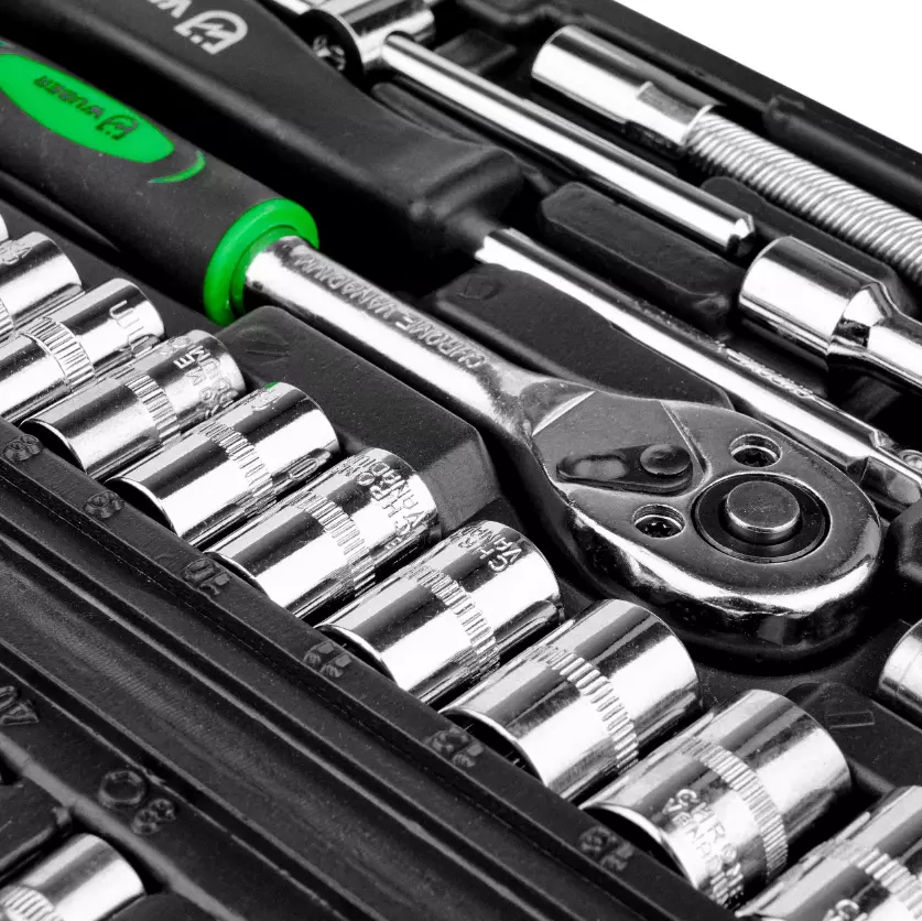 - Широкий ассортимент инструментов, включая торцевые головки разных размеров, биты, шестигранные ключи, адаптеры, шарниры, удлинители и трещотку