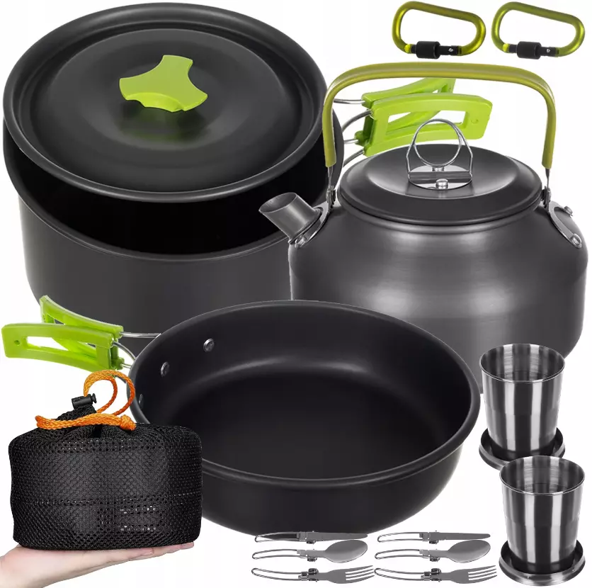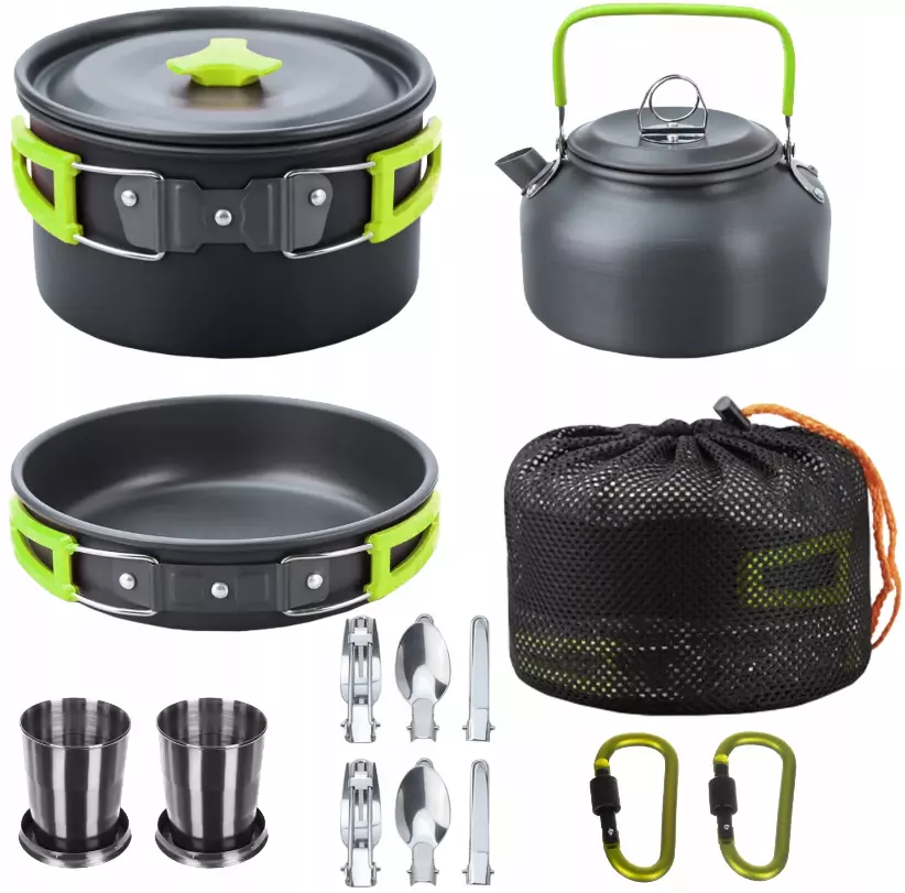 ✔️ Большой набор туристической посуды 18-в-1 - всё, что нужно для готовки на природе: кастрюли, сковорода, чайник, кружки, столовые приборы и другое.