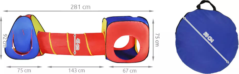 Сумка для хранения и транспортировки палатки имеет ручки, благодаря чему ее очень легко переносить и хранить в сложенном виде. Его можно легко и просто взять с собой в сад, на пляж, на прогулку или в любое другое место, где маленький исследователь захочет поиграть. Палатка 3 в 1 отлично подойдет для каждой поездки, ведь в сложенном виде занимает мало места и имеет плоскую форму, поэтому поместится в багажнике автомобиля.