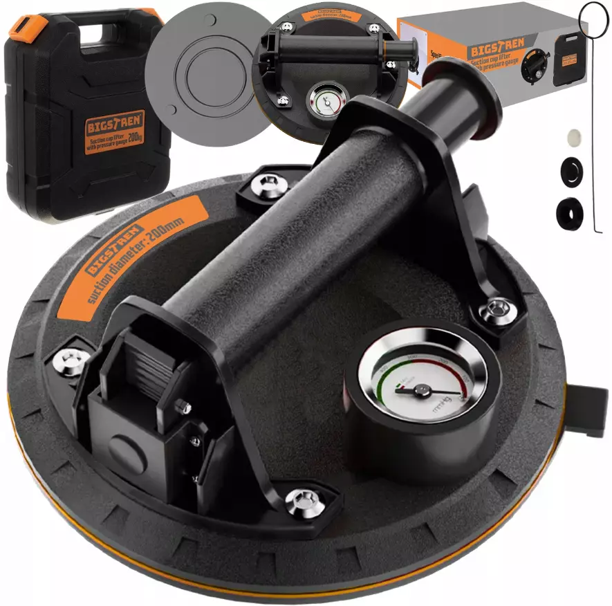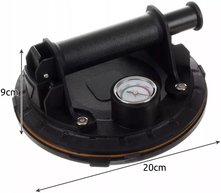 - СПЕЦИФИКАЦИИ - цвет: черный; нескользящая рукоятка: да; грузоподъемность: 200 кг; манометр: 0-760 мм рт.ст.; диаметр присоски: 200 мм; материал: корпус из прочного ABS-пластика + резиновая присоска; размеры: 20 x 20 x 9 см; вес присоски: 1,051 кг; вес упаковки: 1,921 кг