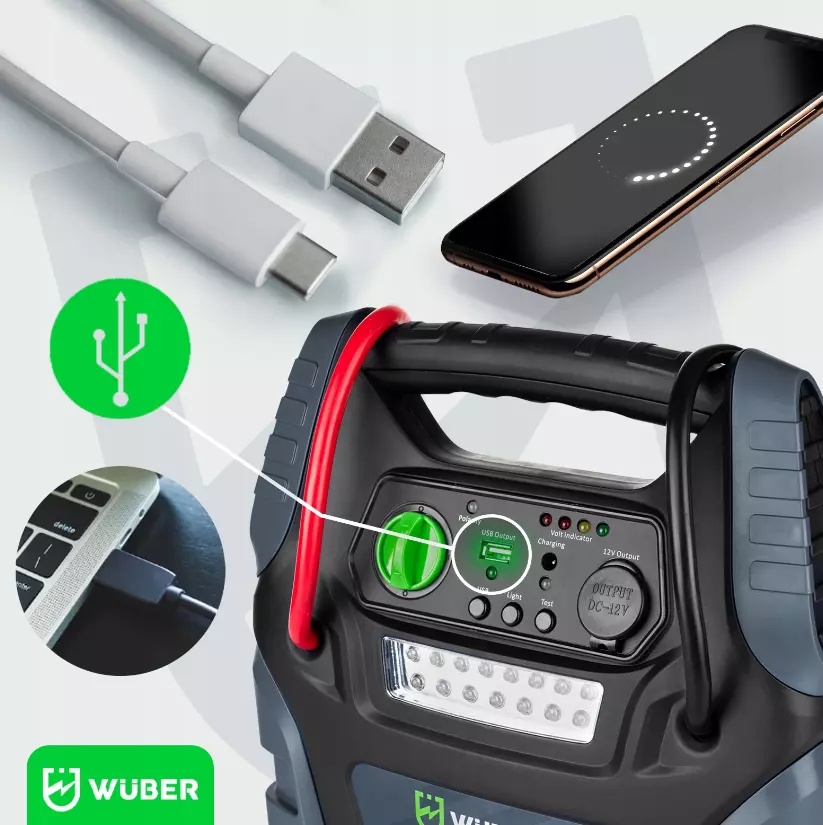 Пусковое устройство оснащено USB-портом, к которому можно подключить кабель и зарядить любое устройство, требующее этого.