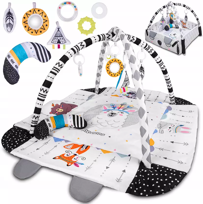 - в комплект входят: коврик, 4 стены, 2 оголовья, 7 многофункциональных игрушек,