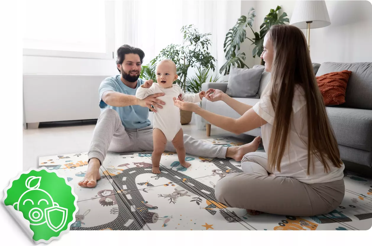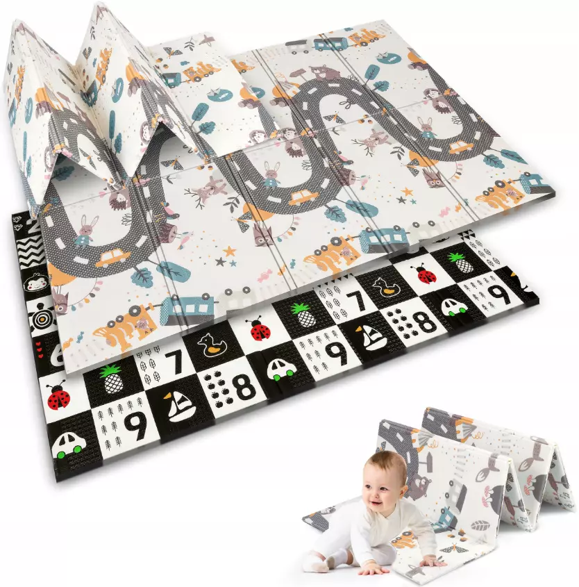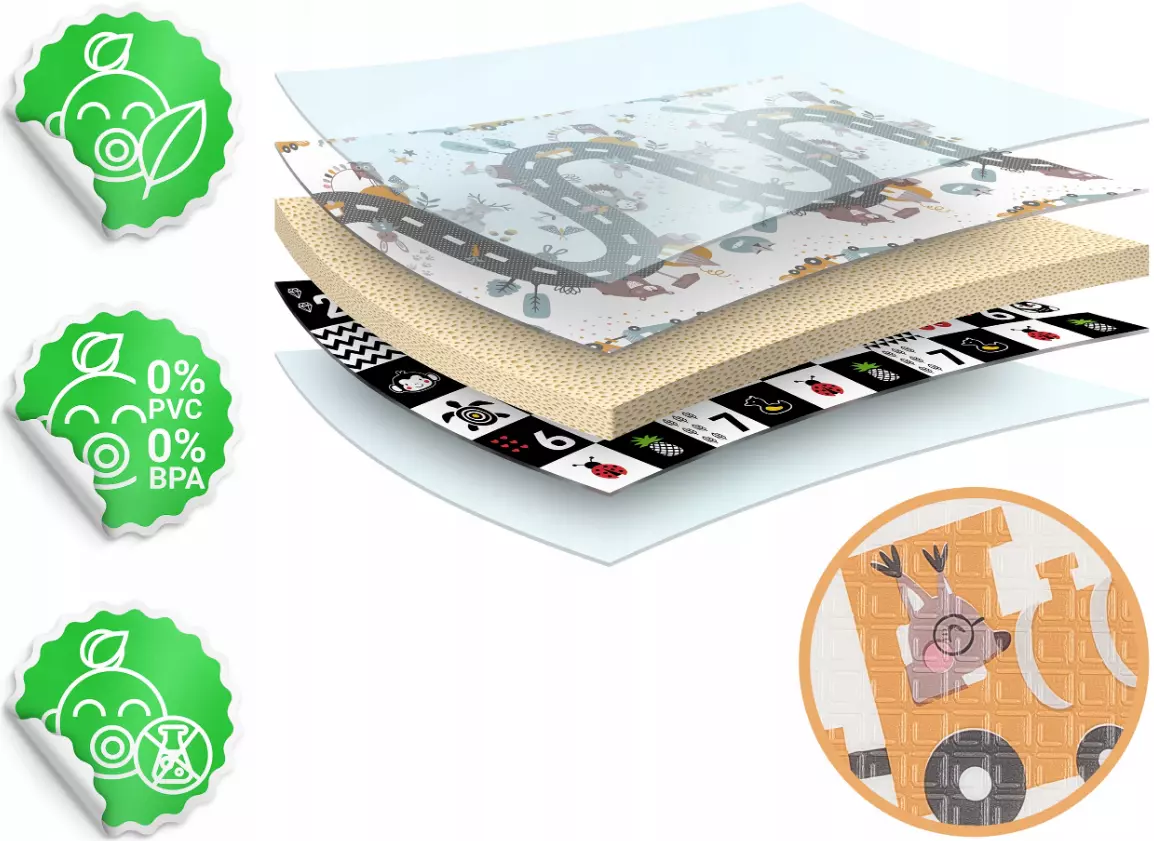 - изготовлен из пеноматериала XPE высочайшего качества без запаха, безопасный для вашего ребенка. Очень толстый поролон (1 см!) смягчает падение на твердом полу.