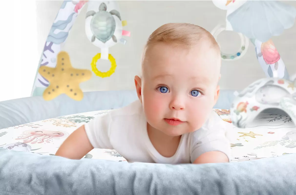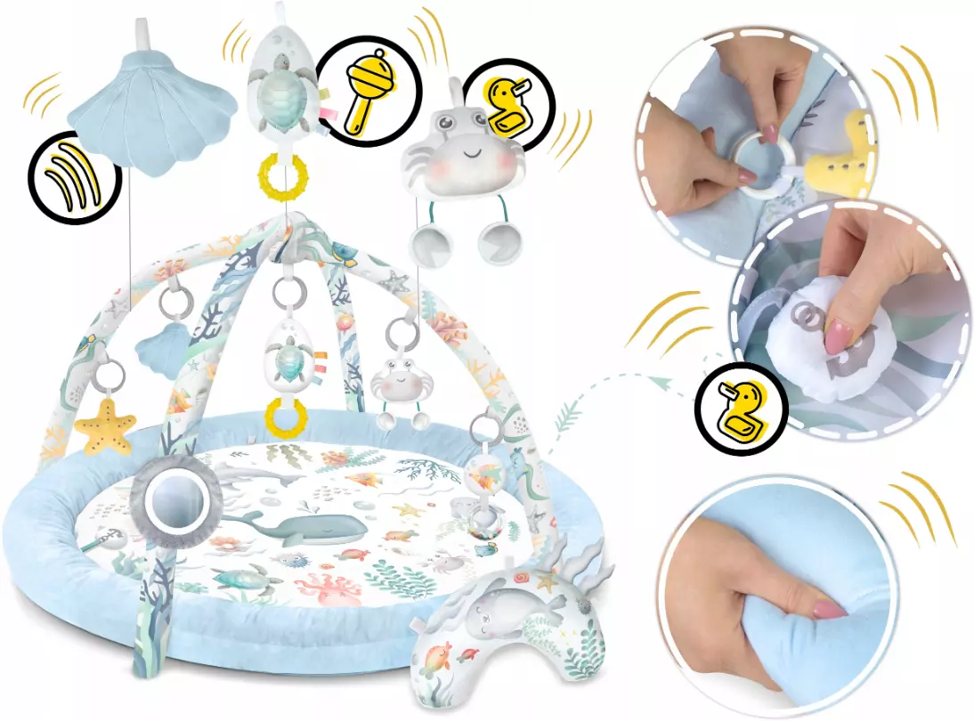 Именно поэтому мы добавили к коврику многофункциональные игрушки, которые можно повесить на дуги - пусть что-то стучит, звенит и шуршит! Среди игрушек есть даже пищащий краб!