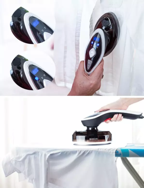 - Утюг - горизонтальная глажка. Благодаря большой керамической подошве, утюг также может использоваться как традиционный утюг – классически расположить выглаженную одежду на доске и использовать устройство горизонтально.