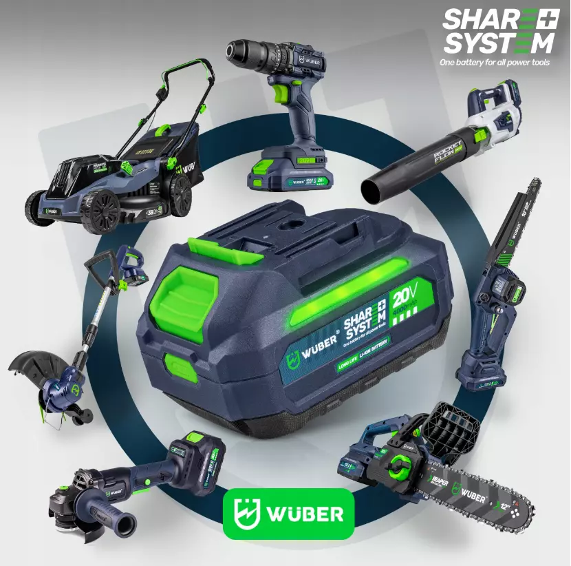 Wuber share + system - это специализированная линейка электроинструментов, работающих от УНИВЕРСАЛЬНЫХ АККУМУЛЯТОРОВ с высокой емкостью и одинаковым напряжением, подходящих для ВСЕХ устройств этой серии.