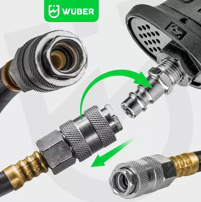 ✅ Быстроразъемные соединения значительно облегчают и ускоряют работу, просто оттяните рычаг пальцем, вставьте шланг и готово!