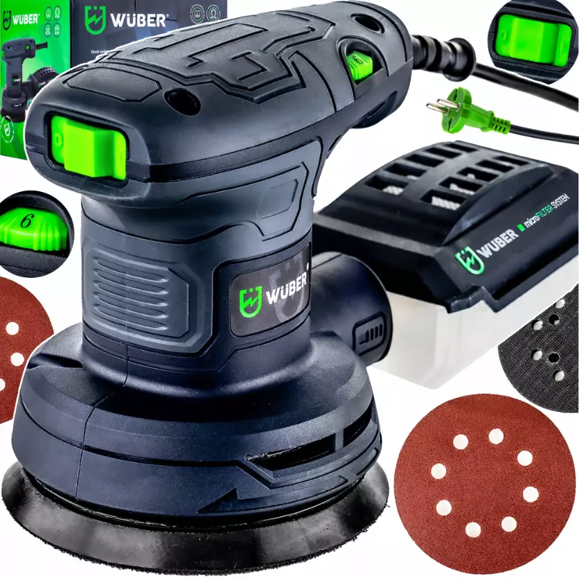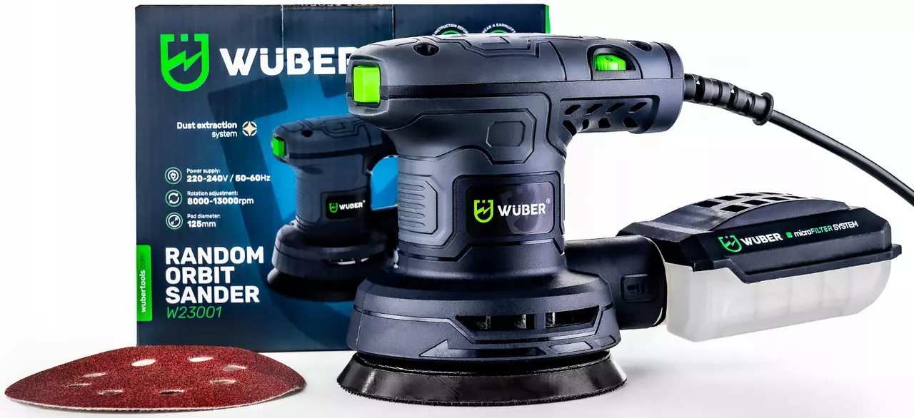 Высококачественная эксцентриковая шлифовальная машина WUBER ► Система пылеудаления ► Высокая мощность 1100 Вт ► Эргономичный дизайн ► Компактный размер ► Регулировка скорости ► Застежка-липучка