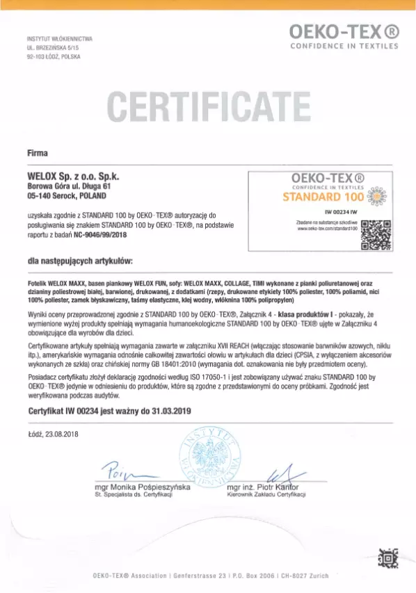 - безопасность Welox® - единственный производитель в Европе, получивший сертификат oeko-tex класса I (дети 0+) для всей своей пенополиуретановой мебели,