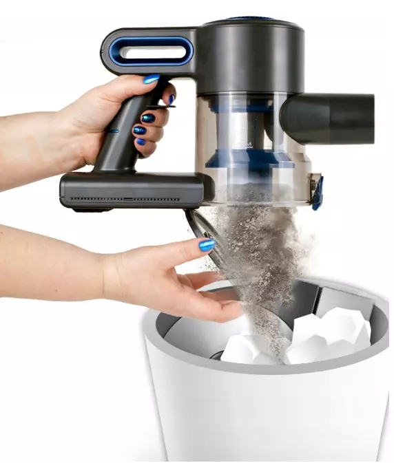 - Перед использованием достаточно присоединить соответствующую насадку с синей кнопкой и запустить пылесос удобной кнопкой на ручке.