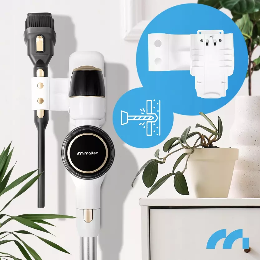 Покупая пылесос MalTec TURBOCYCLONE PRO1000, вы получаете в комплекте практичную настенную станцию, которая облегчает зарядку и организацию аксессуаров.