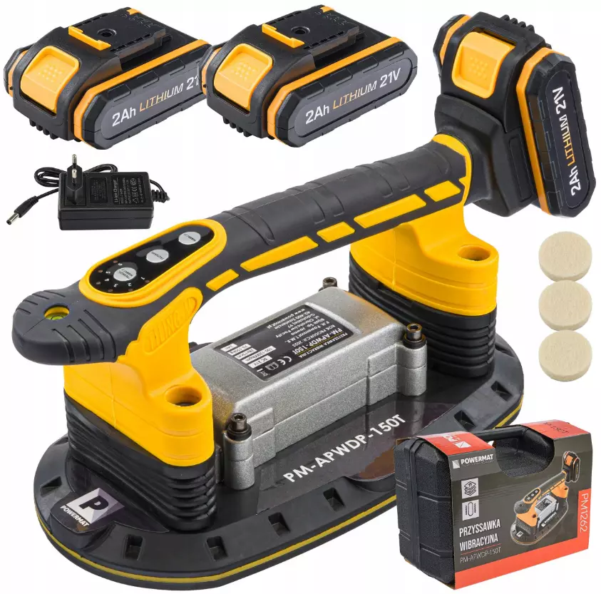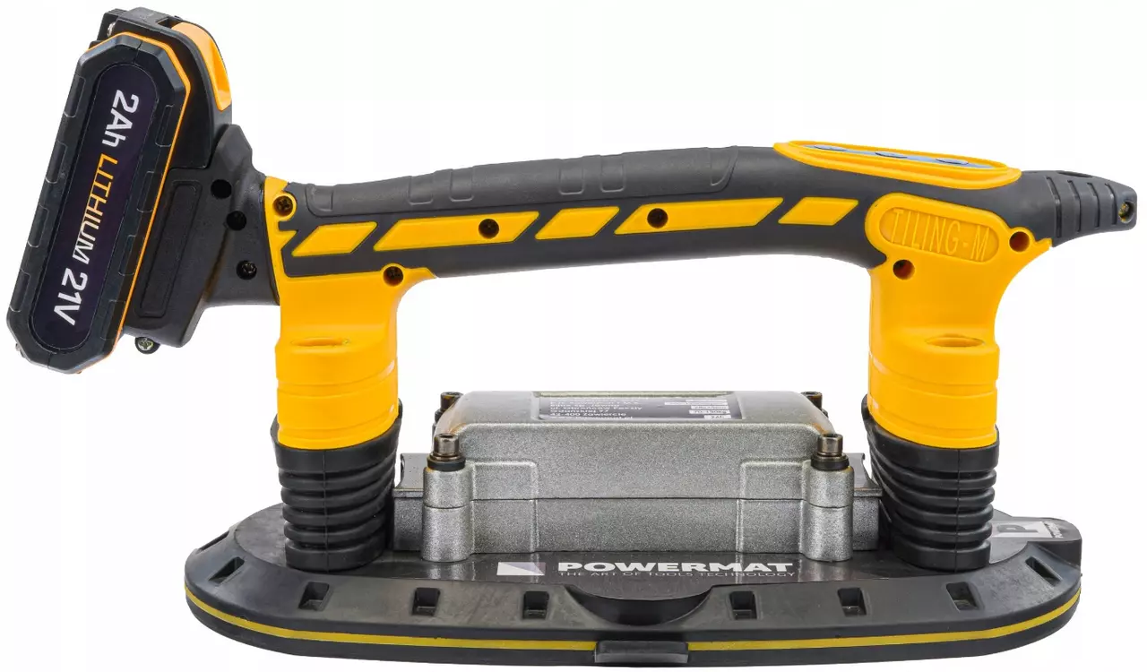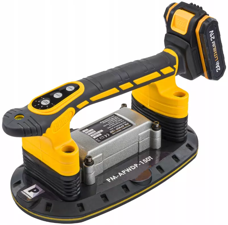 Присоска PM-APWDP-150T питается от литиевой батареи напряжением 21 В и может использоваться для установки внутри и снаружи помещений. Она заменяет традиционную ручную работу и помогает избежать проблем из-за неправильного распределения клея под плиткой и большими панелями. Особая форма и двойная ручка позволяют сохранять баланс груза на этапе подъема и укладки плитки и лучше направлять устройство. Вставки Soft-touch на рукоятке делают захват эргономичным и надежным. Очень компактный и легкий прибор, он позволяет укладывать плитку с помощью присоски (может подниматься до 150 кг), а благодаря вибрации удаляет остаточные пузырьки воздуха, которые, попадая между клеем и плиткой, вызывают трещины. Интенсивность вибрации регулируется нажатием переключателя.