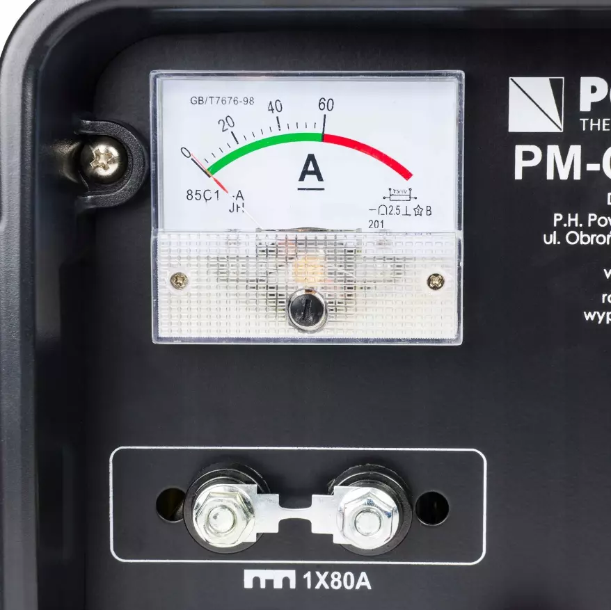 Выпрямитель оснащен аналоговым амперметром, двумя токовыми разъемами PLUS 12v и 24v, предохранителем 80A и постоянно установленным минусовым проводом.
