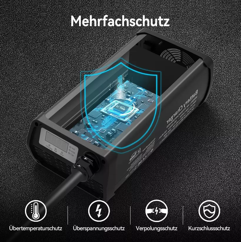 【Эффективность и удобство】В схеме управления зарядным устройством литиевого аккумулятора используется передовая полумостовая резонансная технология управления источником питания с мягким переключением LLC с подходящей структурой и хорошей тепловой конструкцией, что делает зарядное устройство небольшим, легким и портативным.